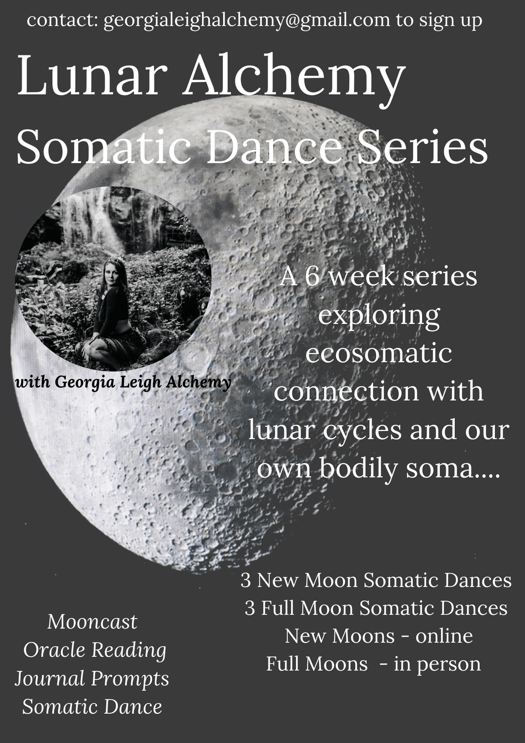 A 6 week series held the week of each Full and New Moon as we use eco-somatic dance to explore our connection to the rhythms of the moon and our cycles as women.