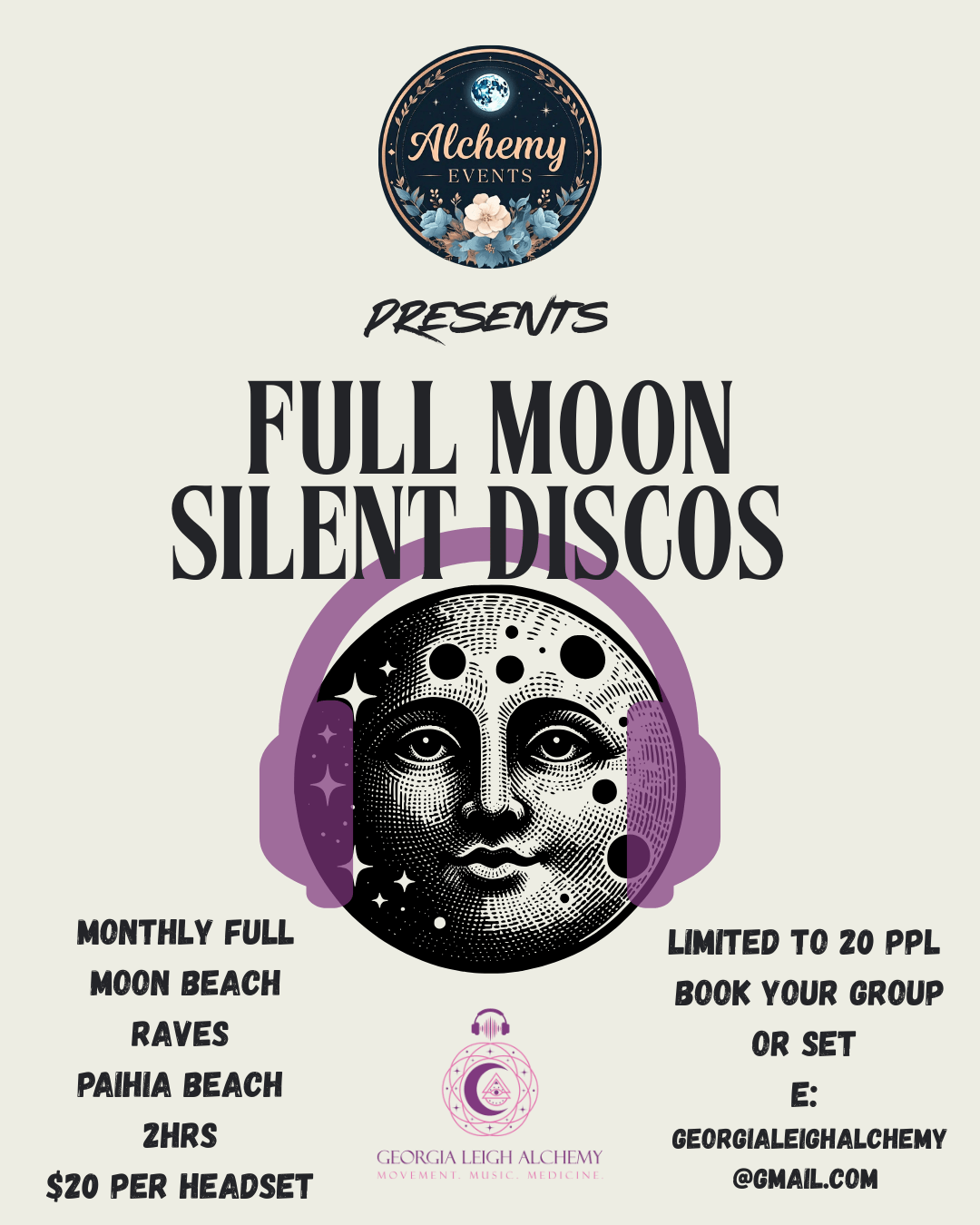 Full Moon Silent Discos are back! Once a month on the beautiful beach of Paihia, the moon will rise and so will we! Limited to 20 headsets, group bookings are welcome or come as you are....DJ Alchemy will play a beautiful soundscape with ambient beats and dance numbers to get your toes twinkling! Email georgialeighalchemy@gmail.com to book your headset and enquire about dates and times.