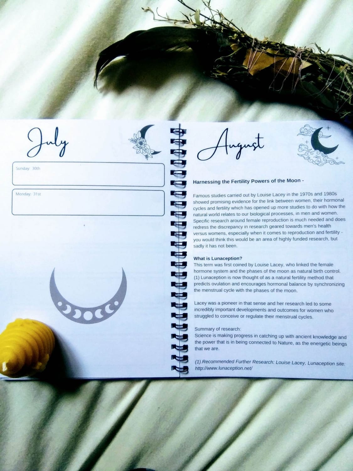 Weekly planner including each Full, New and Eclipse Moon for both the Northern and Southern Hemisphere, as well as pagan holiday dates for both the Northern and Southern Hemisphere